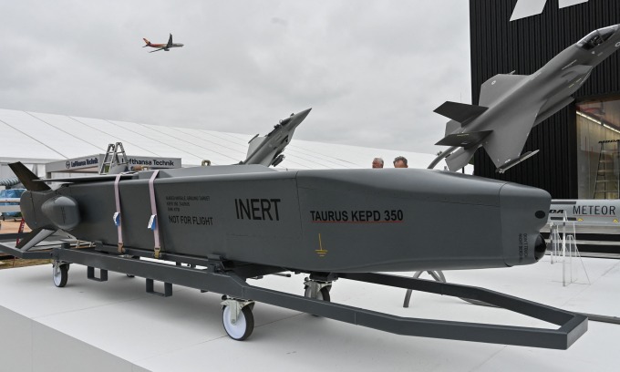 Mô hình tên lửa Taurus được trưng bày tại triển lãm hàng không ở Đức tháng 6/2024. Ảnh: AFP