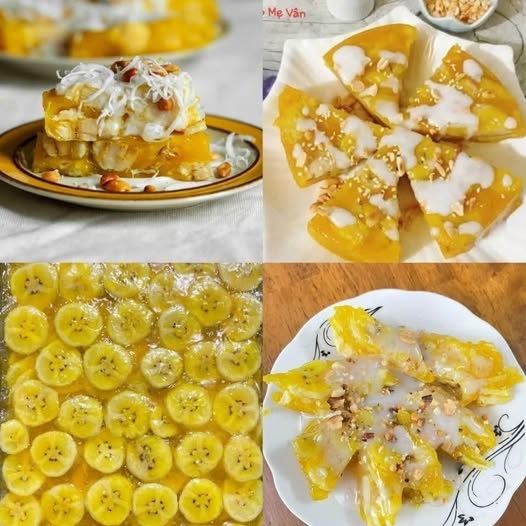 - đổ hỗn hợp chuối vào khuôn,sắp cho đẹp chuối trên mặt.