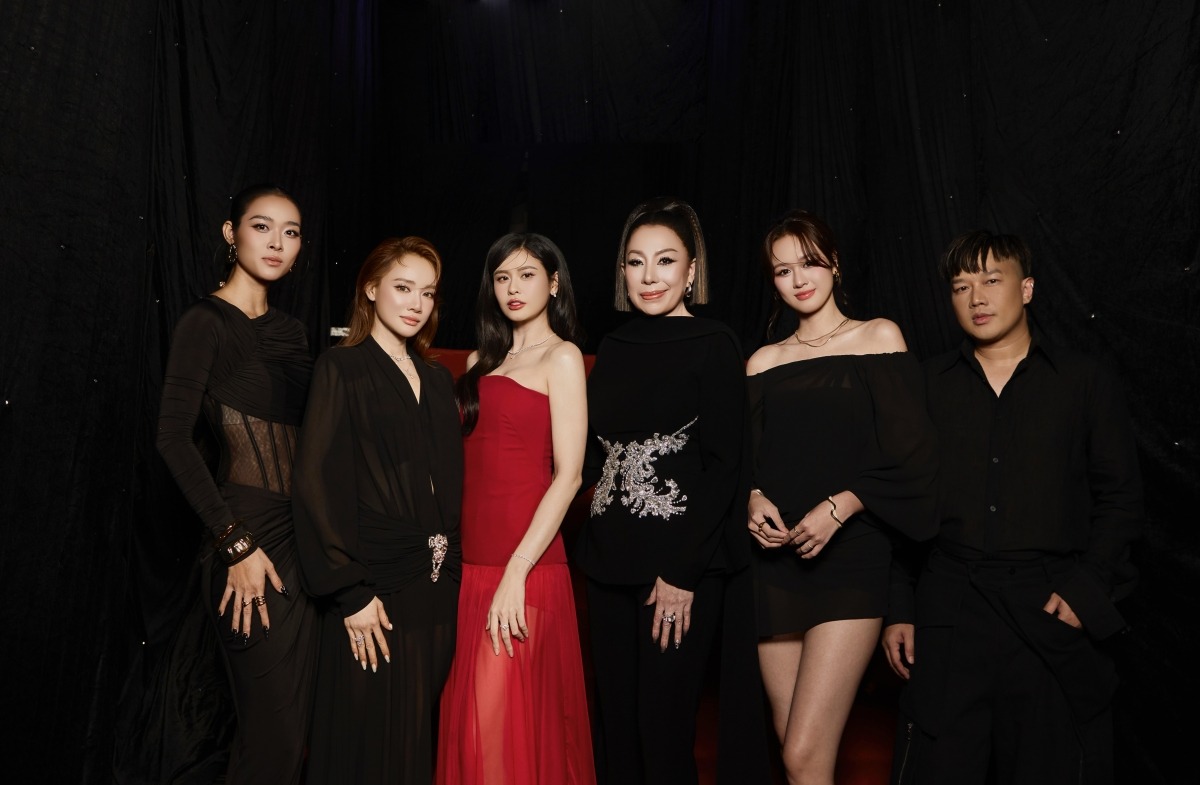 Từ trái qua gồm người đẹp Diệp Bảo Ngọc, Nhã Phương, Trương Quỳnh Anh, nhà thiết kế Linh San, diễn viên Anh Phạm, stylist Lê Minh Ngọc.