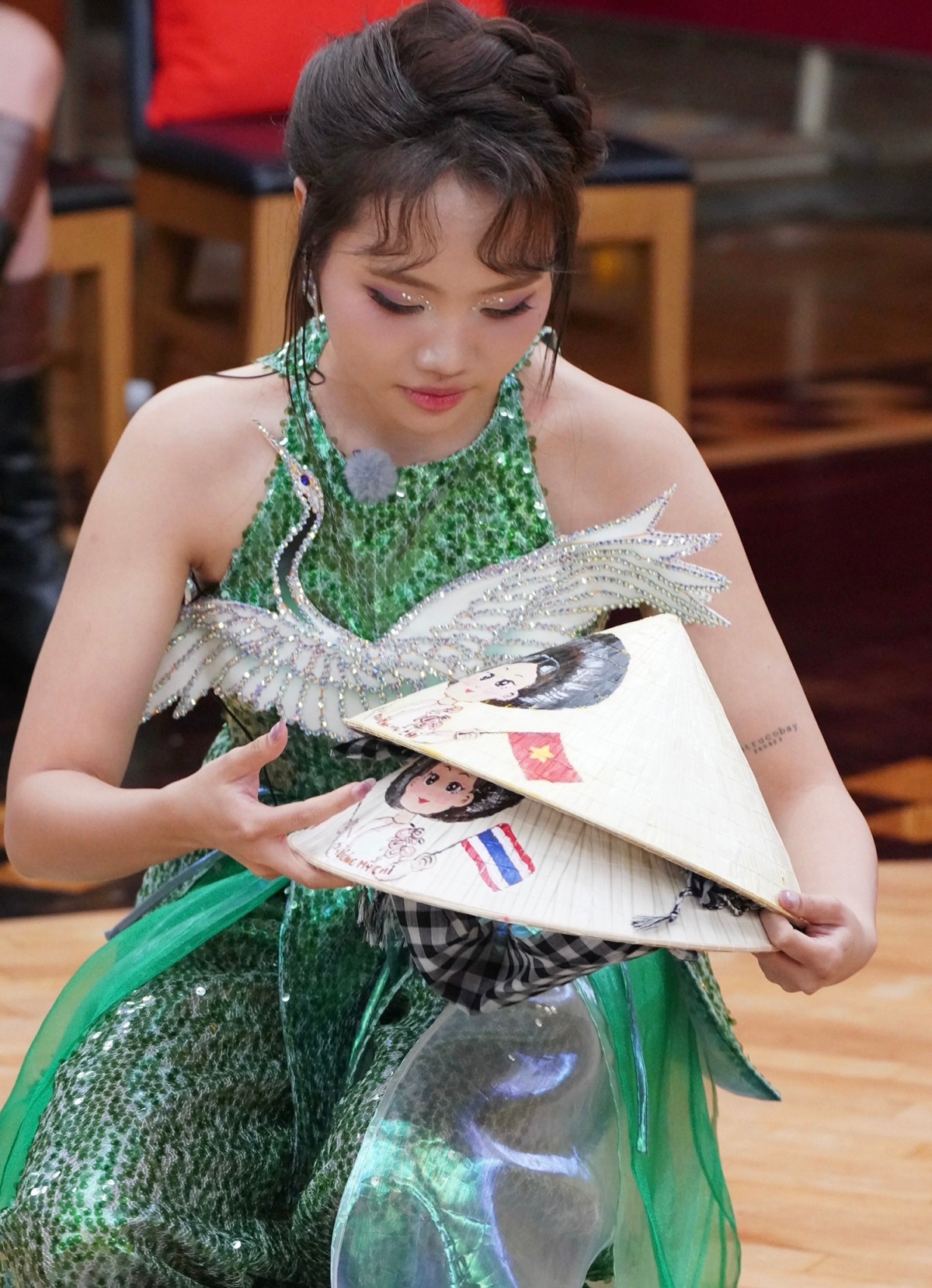 Ca sĩ cũng chuẩn bị 20 chiếc nón lá in hình cô một tay cầm lá cờ Tổ quốc, một tay là quốc kỳ nước bạn làm quà tặng cho các thí sinh. "Hy vọng mỗi chiếc nón sẽ là kỷ niệm đẹp trong lòng bạn bè quốc tế", cô nói.