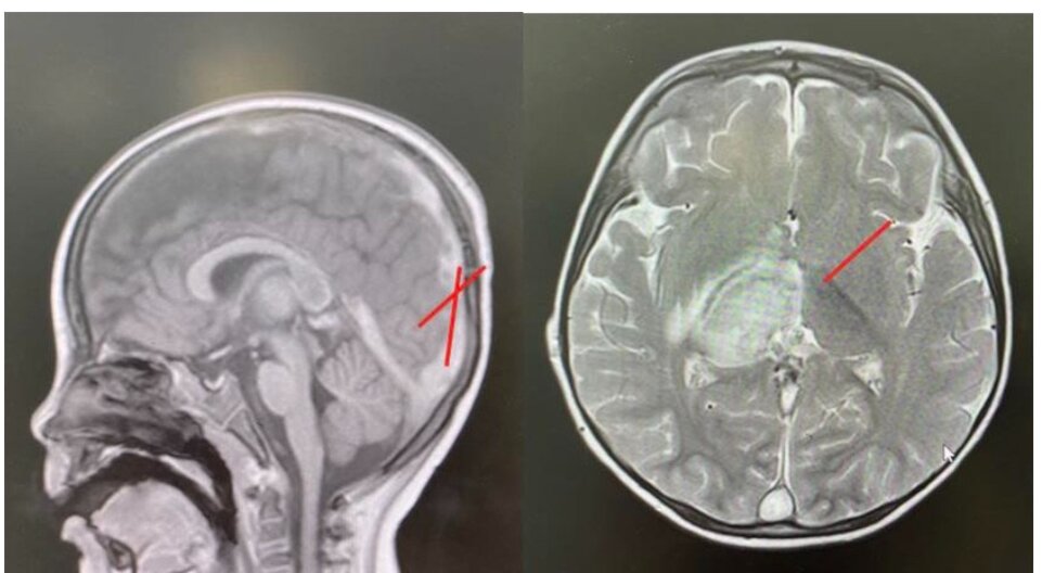 Hình ảnh huyết khối và tổn thương não của bệnh nhi trên phim chụp. Ảnh: BSCC.