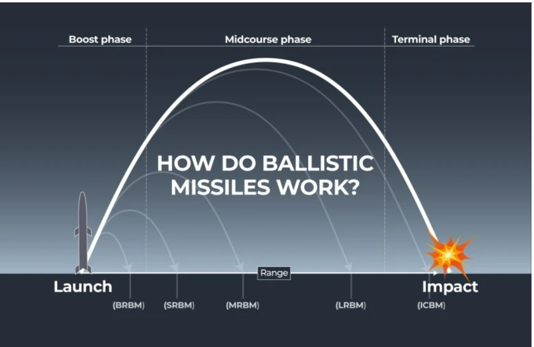 Tên lửa đạn đạo hoạt động theo 3 giai đoạn - phóng, bay lên cao sau đó quay trở lại khí quyển để đánh vào mục tiêu. Ảnh: Al Jazeera.