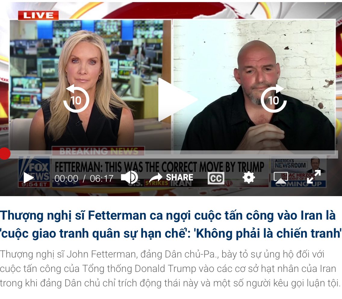 Như tôi đă duy tŕ từ lâu, đây là động thái đúng đắn của @potus", Thượng nghị sĩ Dân chủ Pennsylvania John Fetterman viết trên X vào thứ Bảy. "Iran là nhà tài trợ khủng bố hàng đầu thế giới và không thể có năng lực hạt nhân. Tôi biết ơn và kính trọng quân đội tốt nhất trên thế giới".
