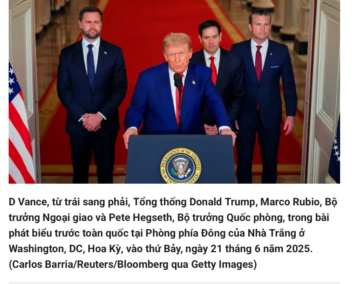 TT Trump đă thông báo về các cuộc tấn công vào Iran vào tối thứ Bảy trong một bài đăng trên Truth Social mà không có thông tin ṛ rỉ trên phương tiện truyền thông hoặc suy đoán rằng các cuộc tấn công sắp xảy ra. Bài đăng bất ngờ trên mạng xă hội này được theo sau chỉ vài giờ sau đó bằng một bài phát biểu ngắn của Trump trước toàn quốc trong khi có Bộ trưởng Quốc pḥng Pete Hegseth , Bộ trưởng Ngoại giao Marco Rubio và Phó Tổng thống JD Vance đi cùng