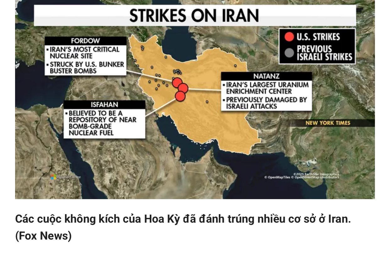 Cách đây không lâu, quân đội Hoa Kỳ đă tiến hành các cuộc tấn công chính xác lớn vào ba cơ sở hạt nhân quan trọng của chế độ Iran: Fordow, Natanz và Isfahan", Trump phát biểu từ Nhà Trắng vào cuối ngày thứ Bảy trong bài phát biểu trước toàn quốc về các cuộc tấn công. "Mọi người đă nghe những cái tên đó trong nhiều năm khi họ xây dựng nên doanh nghiệp hủy diệt khủng khiếp này. Mục tiêu của chúng tôi là phá hủy năng lực làm giàu hạt nhân của Iran và ngăn chặn mối đe dọa hạt nhân do nhà tài trợ khủng bố số 1 thế giới gây ra. Tối nay, tôi có thể báo cáo với thế giới rằng các cuộc tấn công là một thành công quân sự ngoạn mục".