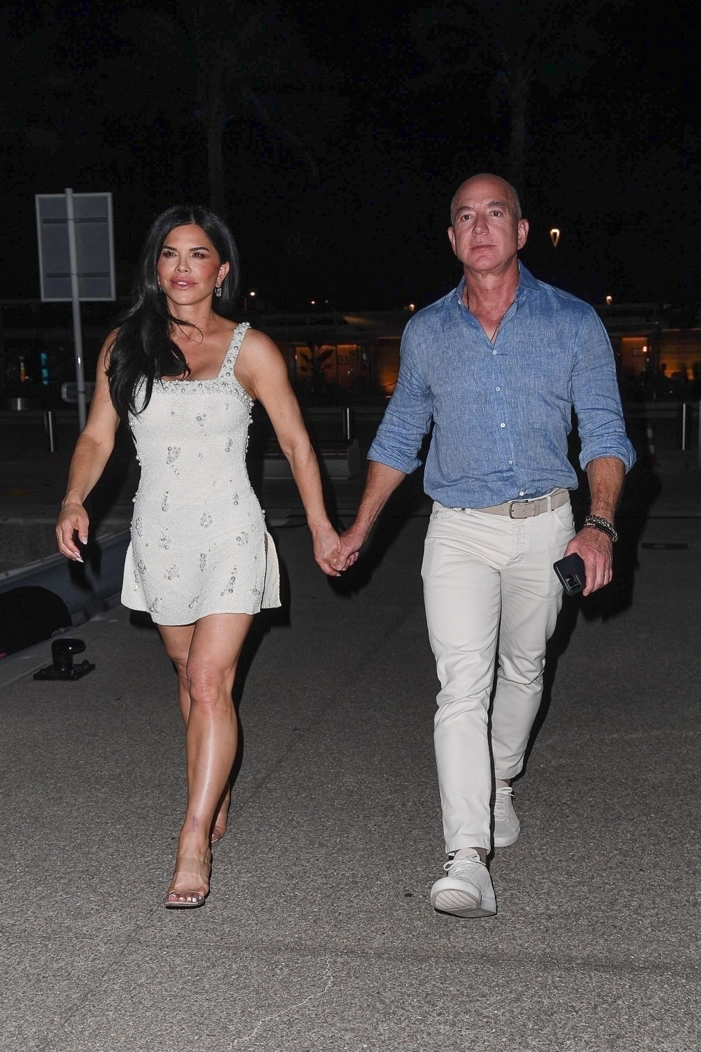 Tháng 5/2023, họ đến Pháp dự một số hoạt động của Liên hoan phim Cannes. Sanchez diện váy mini đính ngọc trai đồng màu quần kaki của Bezos. Ảnh: Backgrid