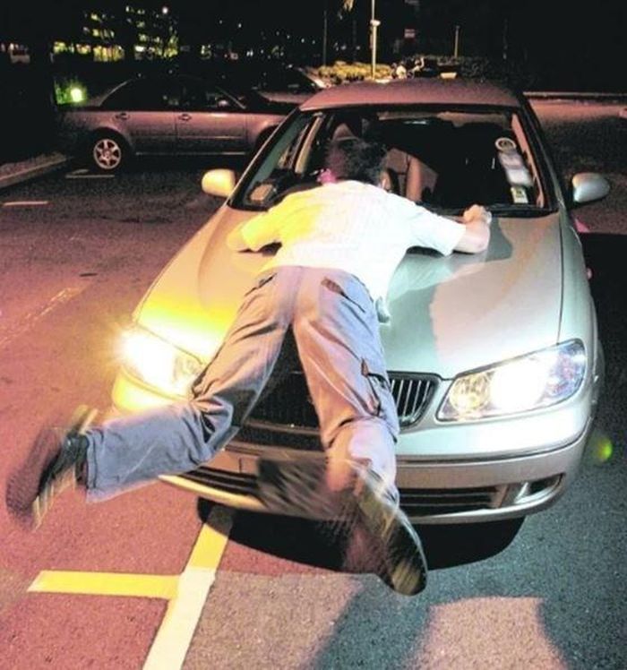 Wu cố gắng mở cửa xe nhưng không thành công. Dù lớn tiếng yêu cầu họ ra ngoài, cả hai vẫn im lặng, không có động thái nào. Quá tức giận, Wu leo lên mui xe nhằm ngăn cản Chia khởi động.