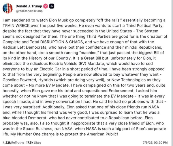 Donald J. TrumpT đã viết một stt về việc ông Elon Musk thành lập lập đảng "