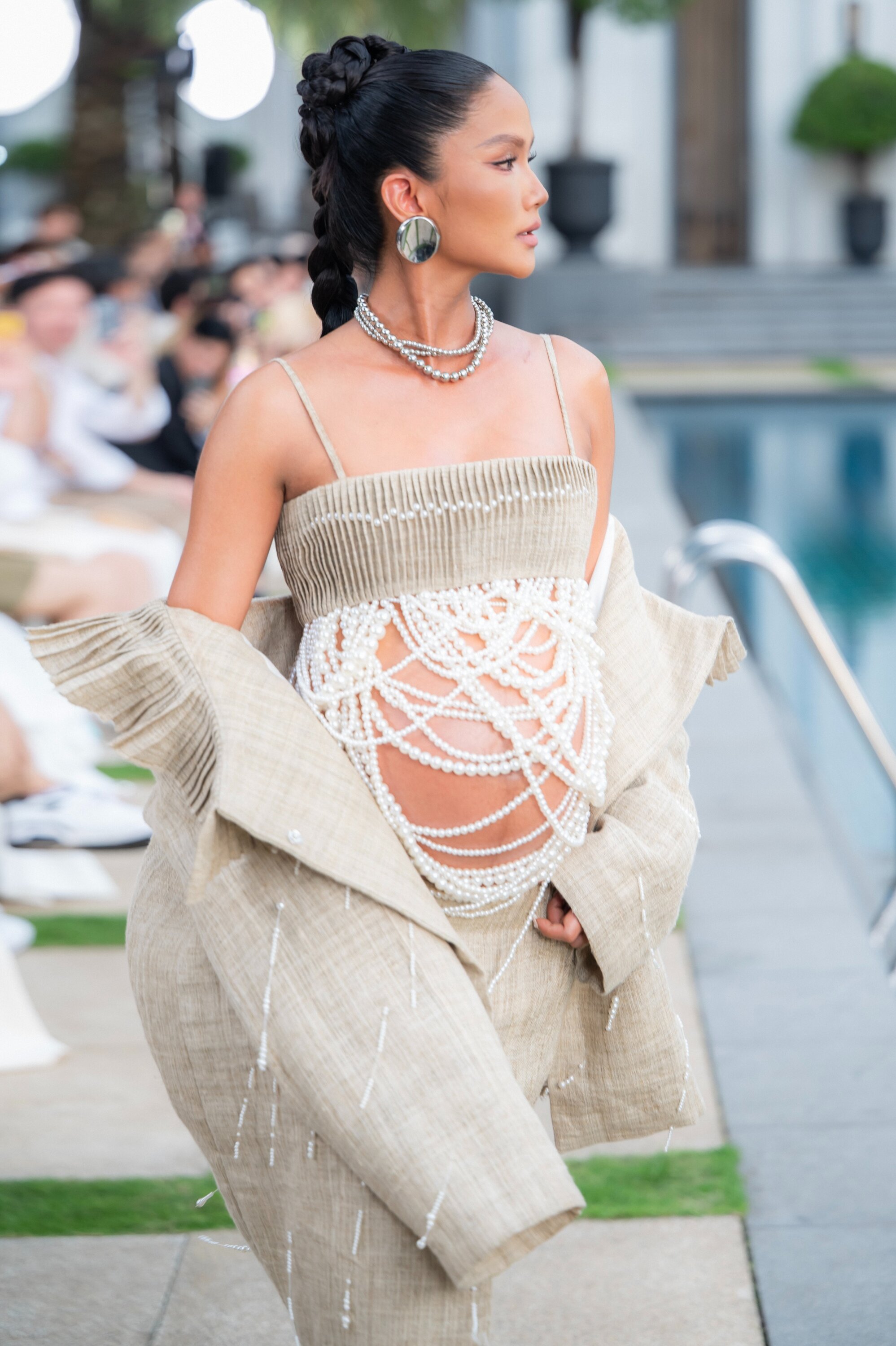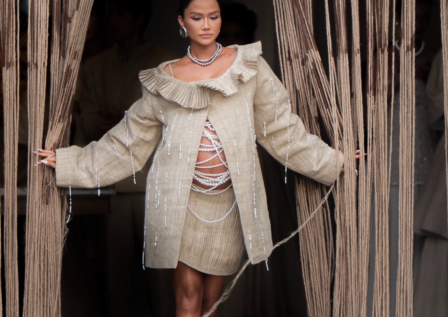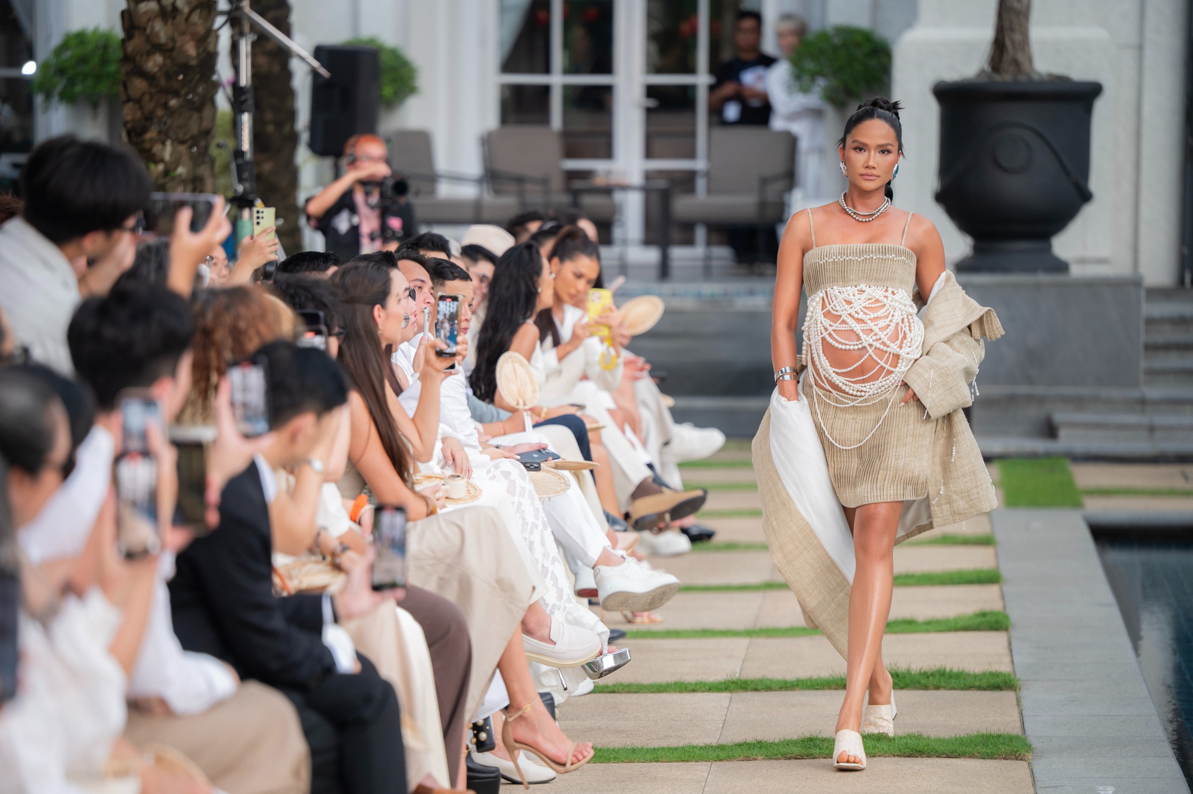 H'Hen Niê mặc áo hai dây, kết hợp chân váy. Khi bước ra sân khấu, cô từ từ tháo lớp áo khoác, để lộ bụng bầu, phủ ngoài là những sợi dây ngọc trai. Mỹ nhân sải bước trong tiếng cổ vũ của khách mời.