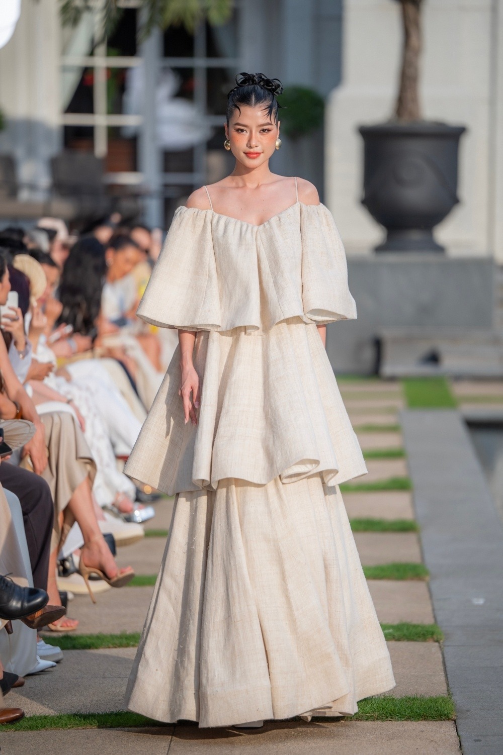 Bộ sưu tập lấy cảm hứng từ những đóa trà my mang vẻ mộc mạc đan xen kiêu sa. Á hậu Hoàng Nhung thể hiện kiểu đầm xếp tầng.
