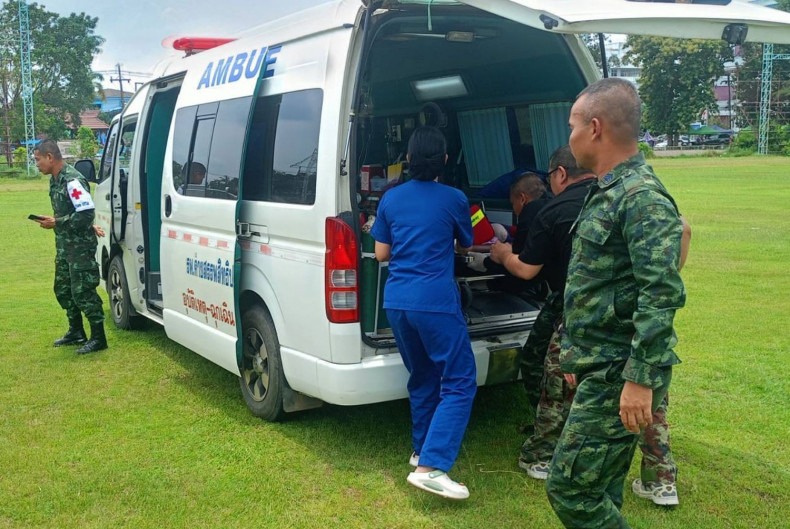 Binh sĩ Thái Lan được chuyển tới bệnh viện sau khi trúng mìn tại tỉnh Sisaket sáng 9/8. Ảnh: Bangkok Post