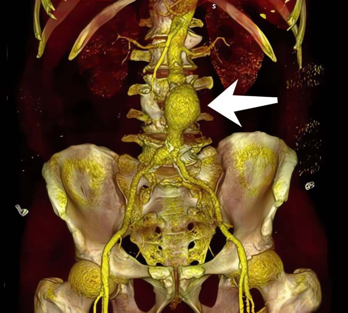 Hình ảnh chụp cắt lớp vi tính phát hiện túi phình động mạch chủ bụng kích thước lớn, có dấu hiệu rò rỉ máu ra ngoài ổ bụng. Người bệnh nhanh chóng được chuyển mổ cấp cứu, kịp thời thay động mạch chủ chậu nhân tạo.