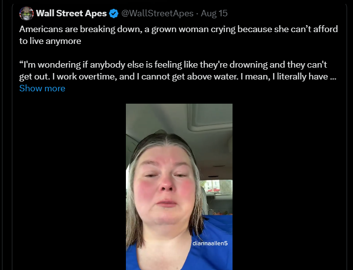 Đoạn video do "diannaallen5" thực hiện cho TikTok đã được @WallStreetApes chia sẻ trên X với 1 triệu người theo dõi X, viết rằng: "Người Mỹ đang suy sụp, một người phụ nữ trưởng thành đang khóc vì không đủ khả năng để sống nữa."