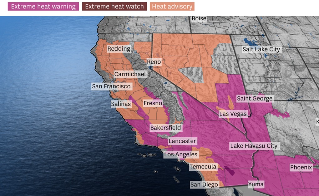 NWS dự báo nhiệt độ có thể vượt quá 43 độ C ở sa mạc phía tây nam và trên 38 độ C ở khắp miền nam California. "Mức nhiệt độ nguy hiểm này sẽ đe dọa bất kỳ ai không có biện pháp làm mát hiệu quả và cung cấp đủ nước", cơ quan này cảnh báo.
