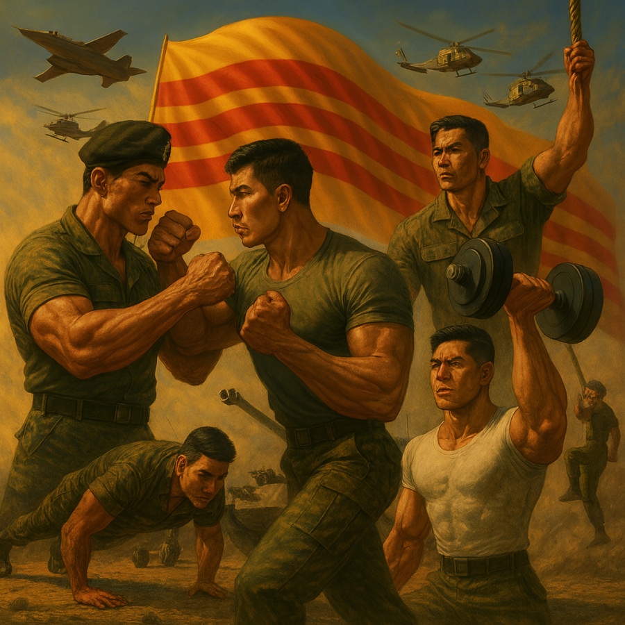 Thế nên, nếu phải trả lời cho gọn: lính VNCH trong “Mưa Đỏ” cao ráo, đẹp trai, to khỏe là vì câu chuyện theo chân một nhánh tinh nhuệ—Biệt cách dù—nơi tiêu chuẩn thể lực lẫn thần kinh đều sấy ở nhiệt độ cao. Họ hay đánh cận chiến “trên kèo” vì bản chất nhiệm vụ: đột kích, thọc sâu, giáp lá cà, và vì ngôn ngữ điện ảnh thích những cú nhào lộn trên biên giới nguy hiểm, nơi nhân vật vừa thắng kẻ thù vừa thắng trọng lực. Còn bộ đội trông có phần gầy và non tay là lựa chọn thẩm mỹ để dựng tương phản: một bên như lưỡi dao đã mài, một bên như chiếc búa mới rèn. Mà chính nhờ tương phản ấy, trận cuối giữa Quang và Cường mới đủ lực để khép màn: không ai là ác quỷ, không ai là siêu nhân; chỉ có những con người nặng trĩu lựa chọn, bước qua nhau trong bụi đỏ, để lại sau lưng những vệt mồ hôi như chữ ký của thời đại. Nếu có điều gì hài hước thì là ở chỗ: mỗi lần Quang xoay người tung đối thủ khỏi kèo, khán giả lại nghe bụng mình “bụp bụp”—không phải tiếng đạn, mà là sáu múi đang vỗ tay.