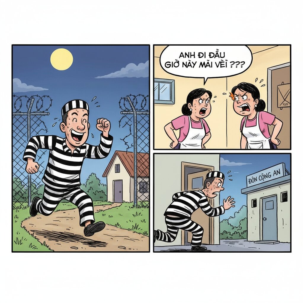 — Em thấy trên tivi đưa tin anh vượt ngục từ 9 giờ sáng. Vậy anh đã đi với con nào mà tới đêm mới mò về hả?