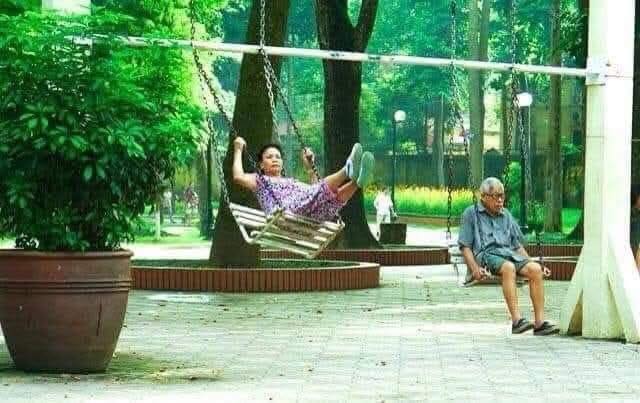 - Sao bà này đu khoẻ vậy, trong khi ông kia lại ngồi ủ rũ như thế?