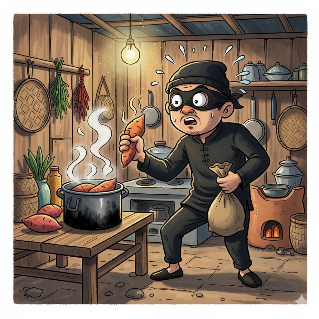 Nửa đêm có tên trộm lẻn vào nhà của hai vợ chồng người Nghệ An, tìm mãi chẳng thấy cái gì đáng lấy. Tên trộm bèn mò xuống bếp thì thấy có nồi khoai luộc, liền tính lấy một củ ăn cho đỡ đói. Bỗng hắn nghe nói:
