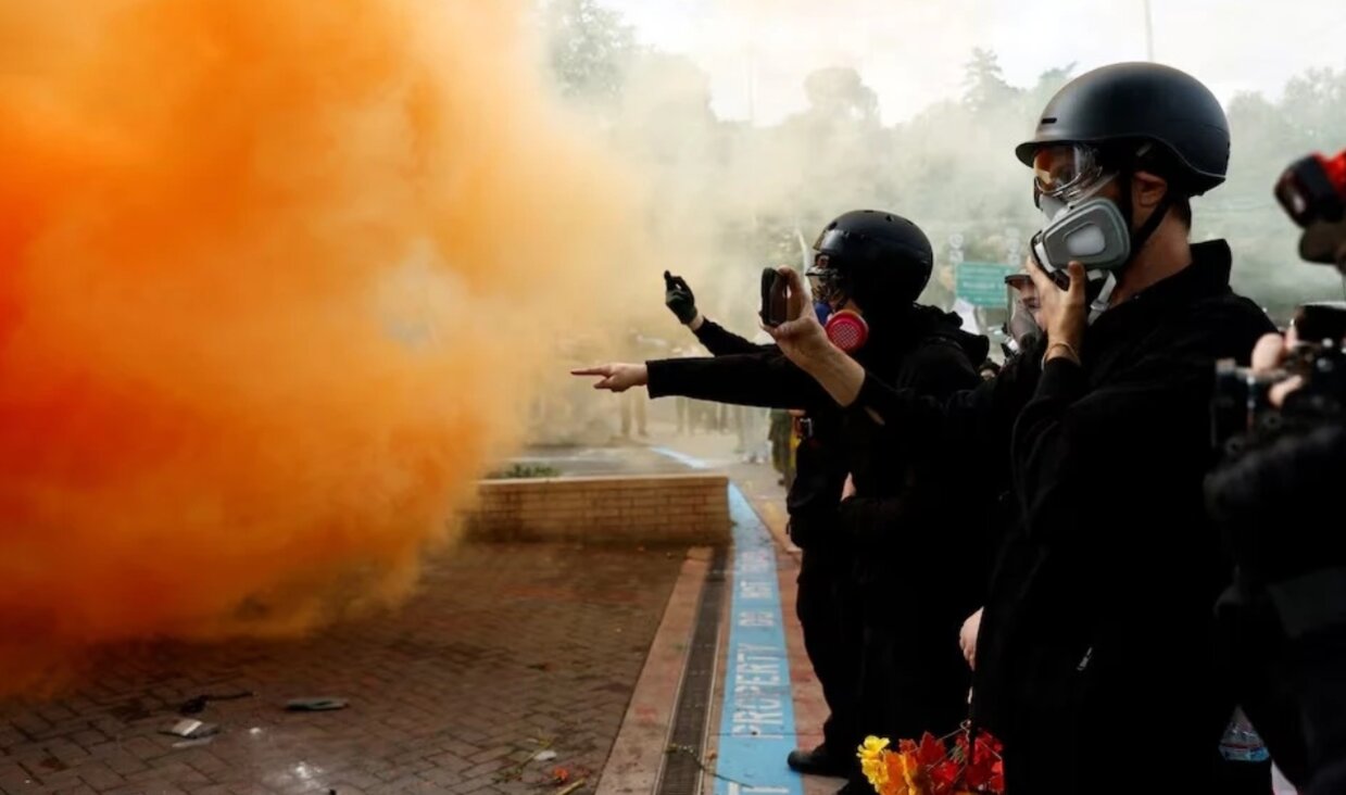 Người biểu tình phản ứng với lựu đạn khói do cảnh sát thả trước trụ sở ICE ở Portland hôm 4/10. Ảnh: Reuters.