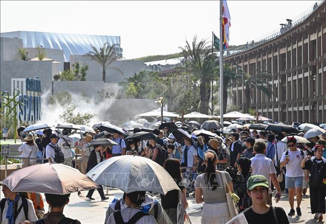 Người dân dùng ô che nắng khi tham quan một triển lãm ở Osaka, Nhật Bản. Ảnh: Kyodo/TTXVN