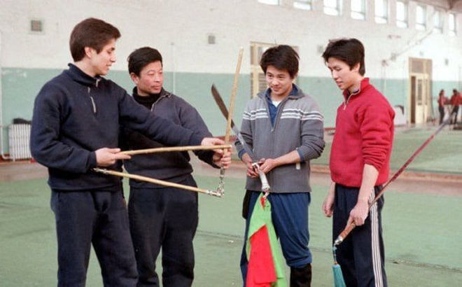 Võ sư Ngô Bân (thứ hai từ trái sang) hướng dẫn Lý Liên Kiệt và Chân Tử Đan.