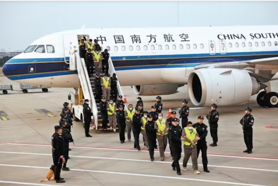 Khoảng 200 công dân Trung Quốc bị tình nghi phạm tội trong các khu phức hợp lừa đảo ở Myawaddy, Myanmar, được đưa về Trung Quốc năm 2024. Ảnh: Tân Hoa Xã