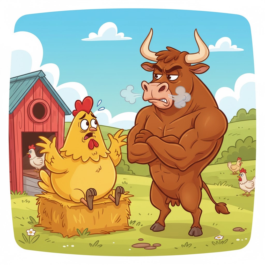 Một hôm, gà mái ngồi tâm sự với bò đực trong chuồng: