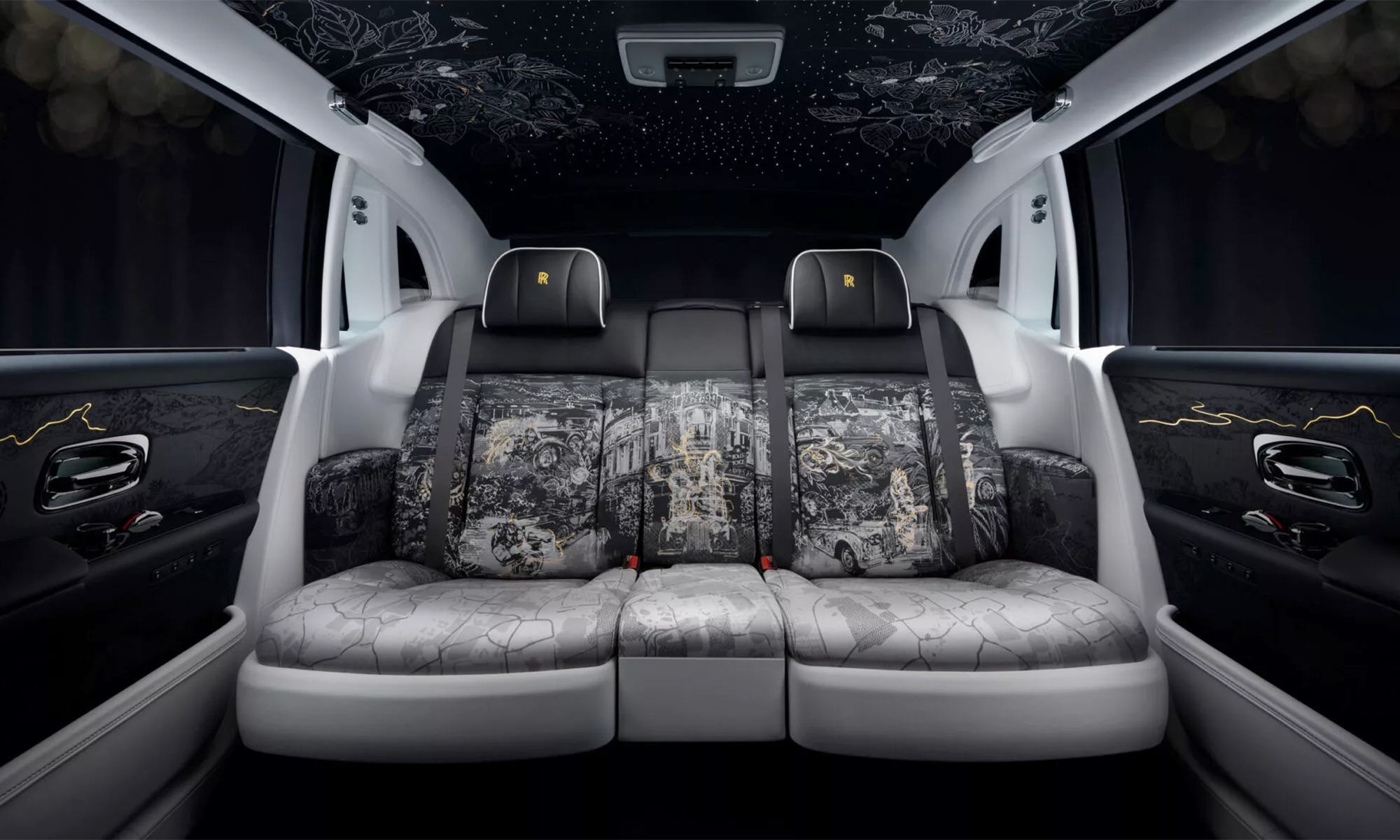 Nội thất của Phantom Centenary giống như bước ra từ truyện tranh, hàng ghế sau bọc vải in độc đáo, trong khi 160.000 mũi thêu được thêu dọc theo băng ghế sau. Hàng ghế trước bọc da khắc laser với nhiều hình vẽ hơn, với màu sắc chuyển dần từ trắng sang đen.