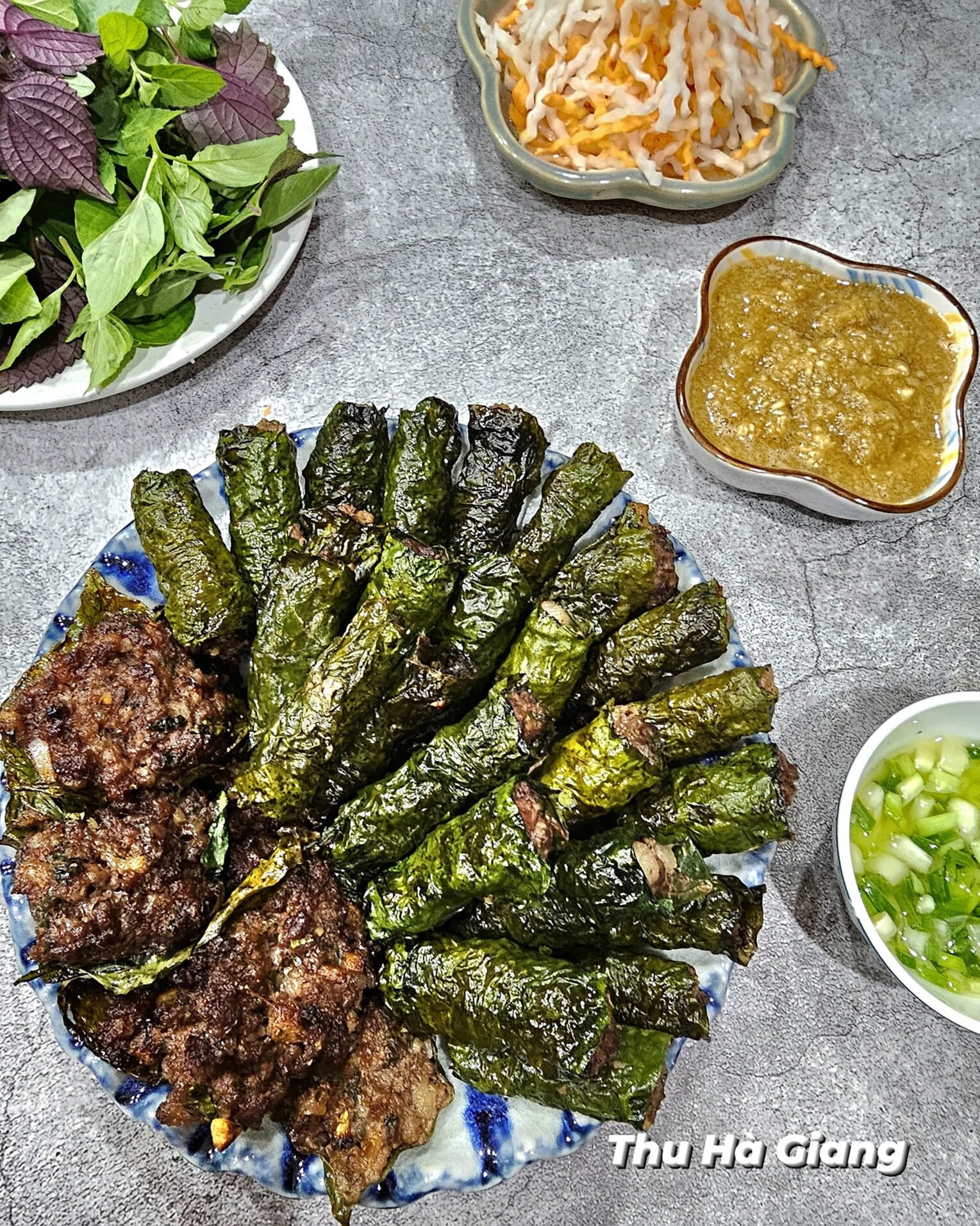 Thành phẩm là cuộn bò béo ngậy đậm vị thơm phức mùi lá lốt, không bị khô do có phần mỡ gáy thái hạt lựu. Ăn cùng sốt mắm nêm, rau thơm, lá bạc hà ta nói thơm nồng tròn vị.