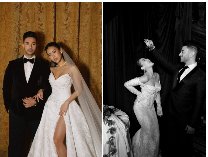 Trong buổi chụp, Tiên Nguyễn thay đổi nhiều trang phục đến từ các thương hiệu Nicole + Felicia Couture, Berta và Pallas Couture Privée, còn Justin diện bộ tuxedo lịch lãm của Dolce & Gabbana.