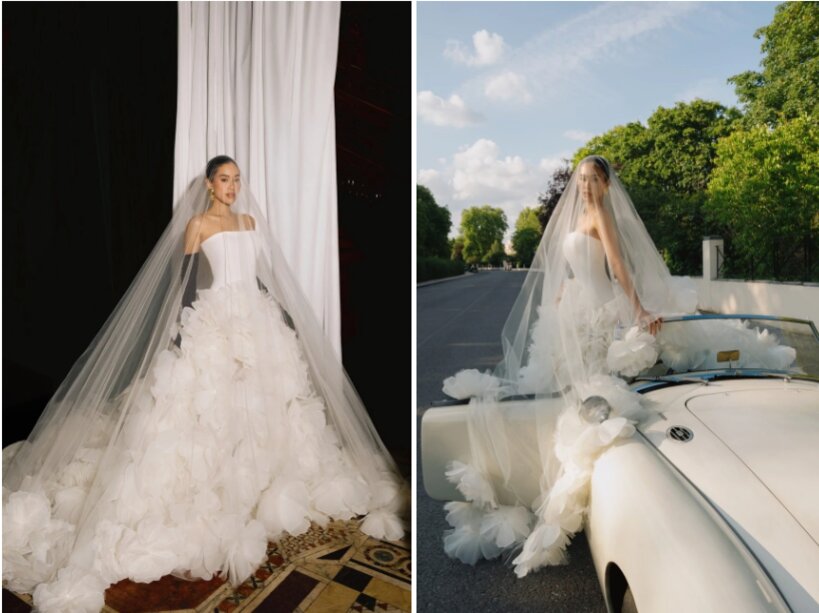 Trong đoạn video, Tiên Nguyễn thay nhiều thiết kế váy cưới sang trọng, trong khi người đàn ông bên cạnh cô diện vest bảnh bao. Hai người trao nhau nụ hôn ngọt ngào, cử chỉ tình tứ. Một khung cảnh quay cận chiếc nhẫn kim cương trên tay trái của rich kid Sài thành.
