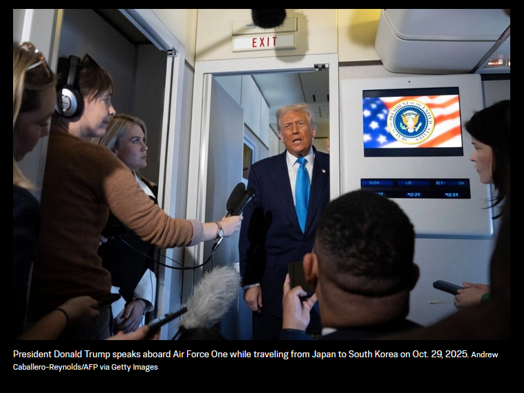 Tổng thống Donald Trump phát biểu trên chuyên cơ Không lực Một trong chuyến công du từ Nhật Bản đến Hàn Quốc vào ngày 29 tháng 10 năm 2025. Andrew Caballero-Reynolds/AFP qua Getty Images