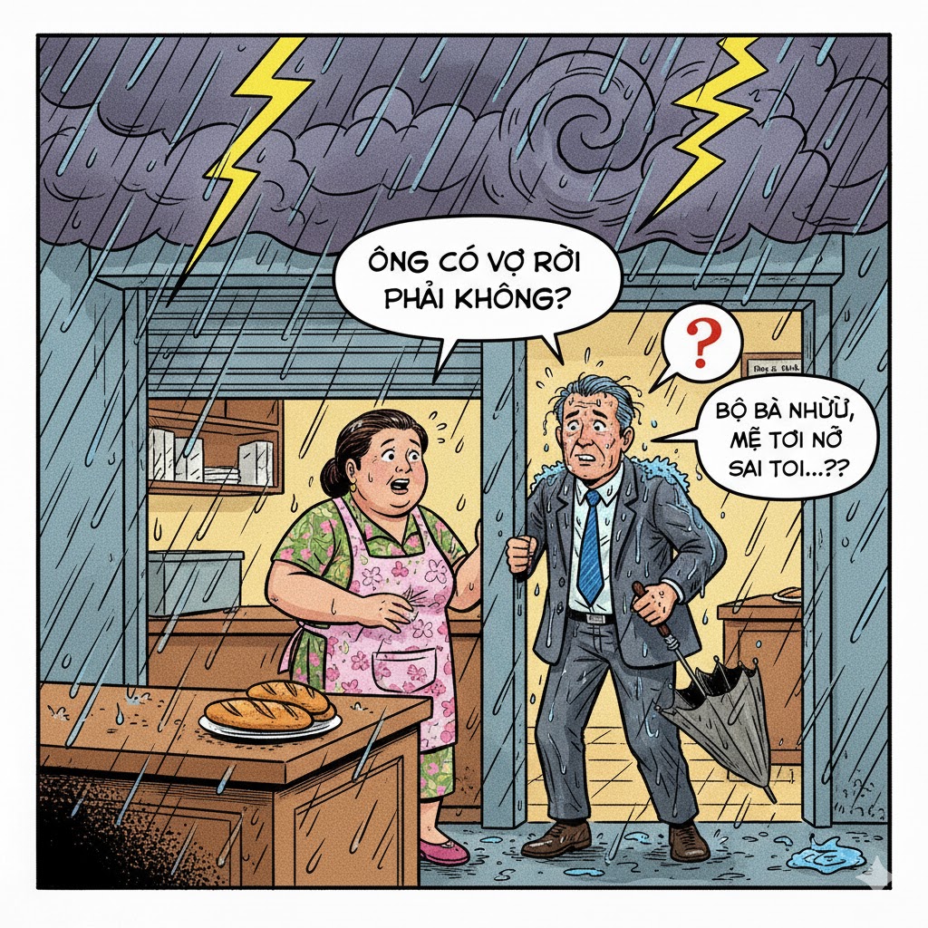 Người đàn ông ngạc nhiên: – Thì đúng là có vợ rồi. Bộ bà nghĩ, mẹ tôi nỡ sai tôi đi mua một ổ bánh mì trong trời dông bão như thế này sao?