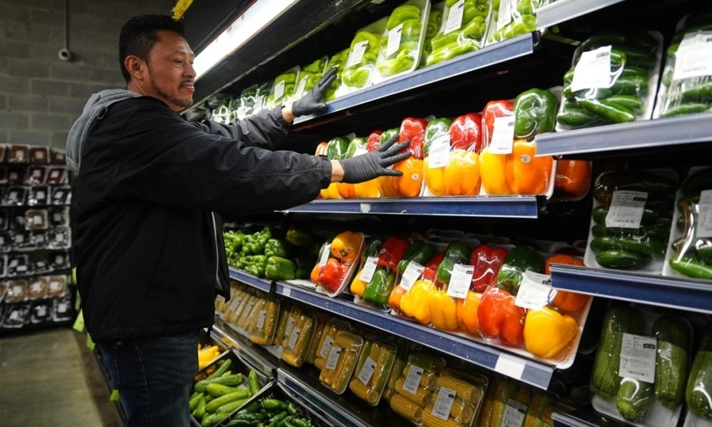 Nhân viên một cửa hàng tạp hóa sắp xếp lên kệ những mặt hàng được hỗ trợ bởi chương trình SNAP tại Baltimore hôm 30/10. Ảnh: AP
