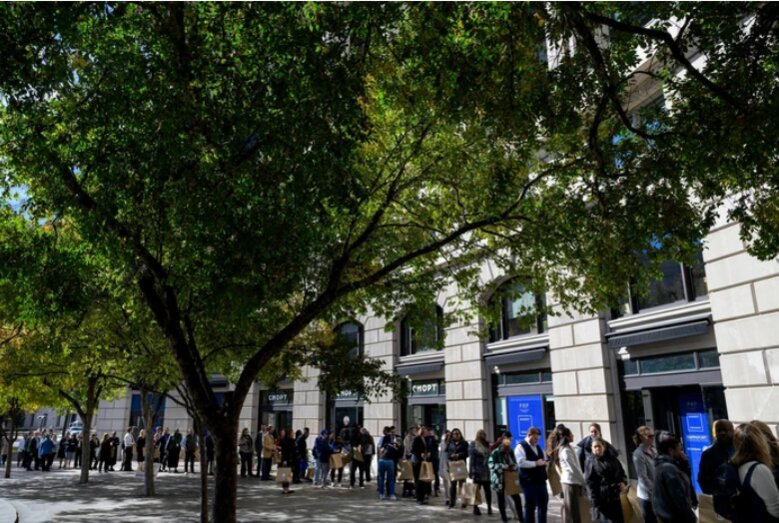 Hàng trăm nhân viên liên bang và gia đình xếp hàng chờ nhận bữa ăn miễn phí từ World Central Kitchen gần Quảng trường Tưởng niệm Hải quân Mỹ tại Washington hôm 5-11. Ảnh: AP