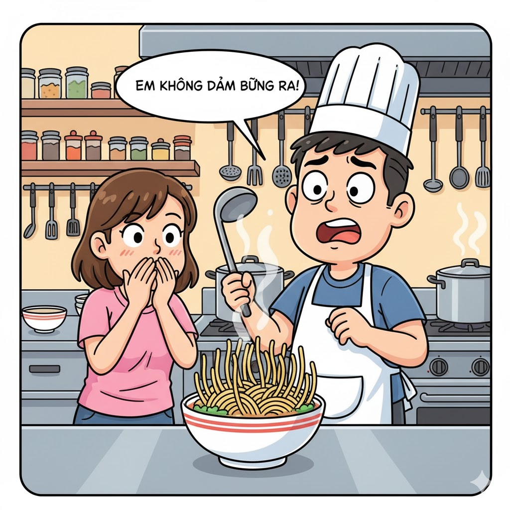 Cô gái đứng hình. Bạn trai thì vẫn ngồi ngoài, đói bụng, không biết rằng tô phở của mình đang… nổi loạn trong bếp.
