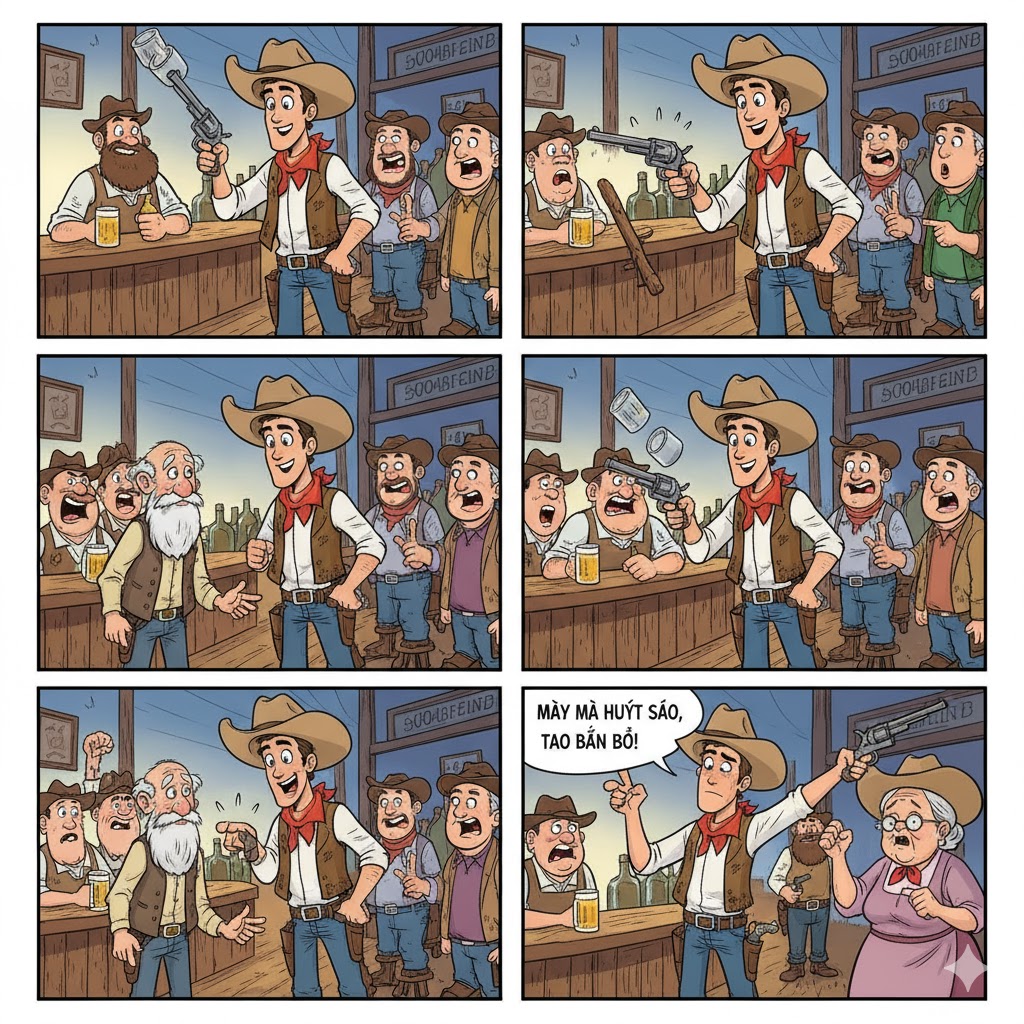 Bỗng đâu có... bà già cao bồi xuất hiện, rút súng kê vào đầu chàng trẻ: