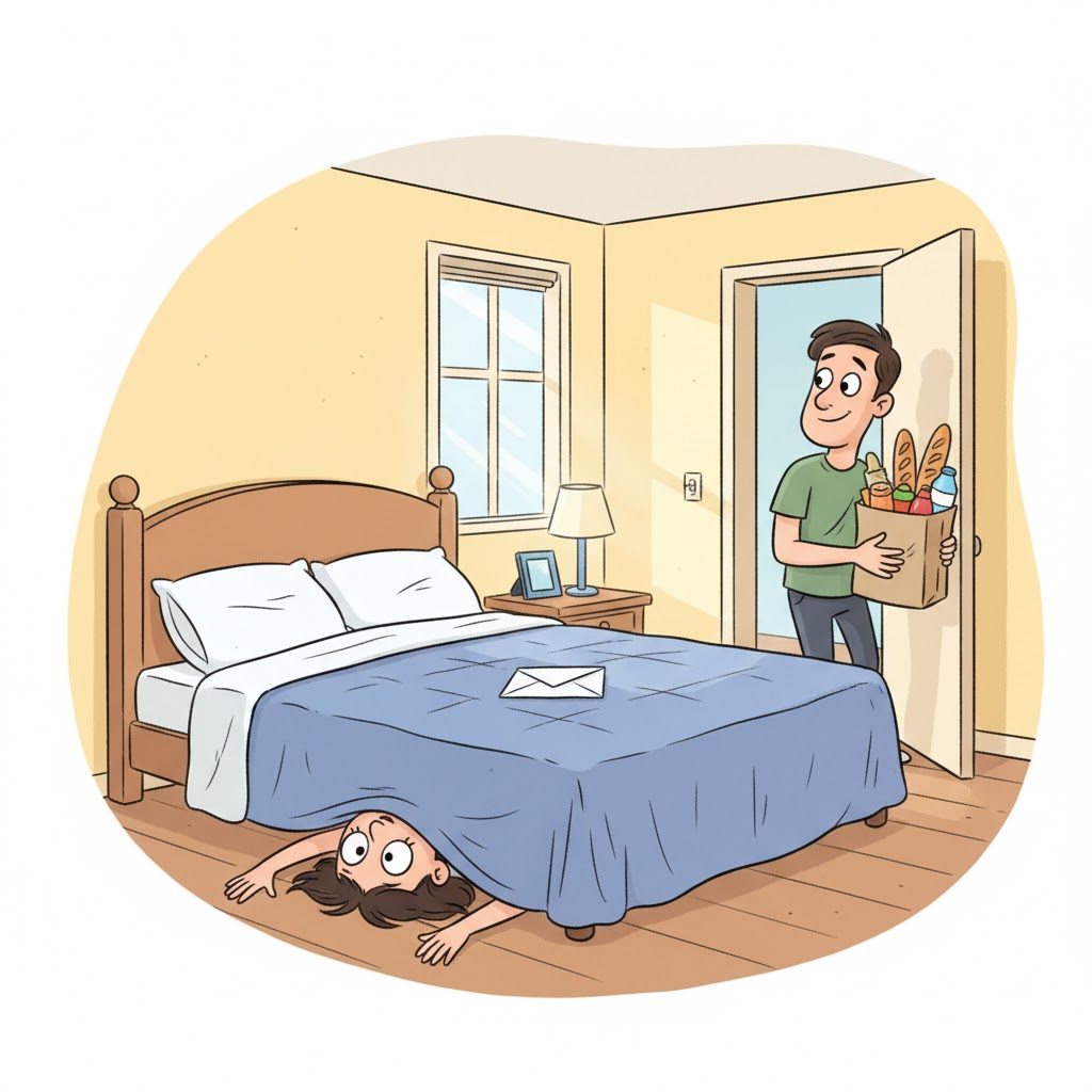 Một ngày nọ, cô vợ muốn thử lòng chồng. Cô viết một bức thư để lại trên tủ đầu giường, trong đó nói rằng cô đã chán chồng, không muốn sống cùng nữa. Viết xong, cô chui xuống gầm giường, hồi hộp chờ phản ứng.