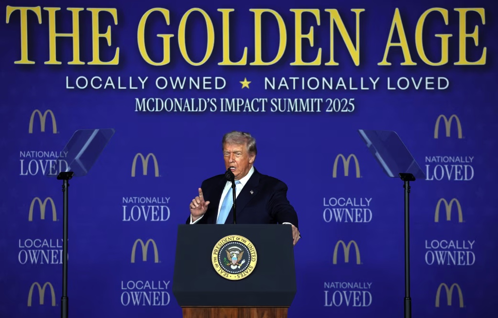 President Donald Trump bước lên bục nói chuyện trước hội nghị các chủ franchise McDonald’s ở Washington với tâm thế của một người vừa thắng lớn: ông gọi đây là “thời hoàng kim của nước Mỹ”, rồi say sưa kể chuyện sandwich Filet-O-Fish ưa thích, chuyện lần ông mang tạp dề đứng chiên khoai ở một cửa hàng McDonald’s tại Pennsylvania. Dưới mái vòm Golden Arches, Trump dựng nên một bức tranh kinh tế rực rỡ: “Chưa bao giờ như bây giờ. Chúng ta đang làm tốt hơn bất kỳ thời điểm nào trong lịch sử. Giá cả đang đi xuống, tất cả mọi thứ.”