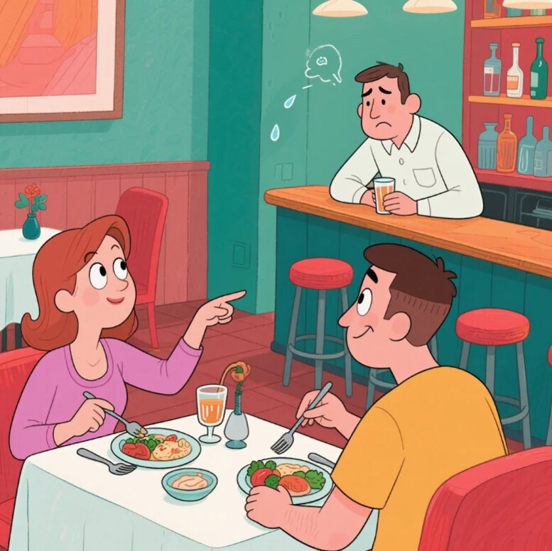 Giữa bữa ăn tối, cô vợ bỗng huých tay chồng, chỉ về phía góc quầy bar: