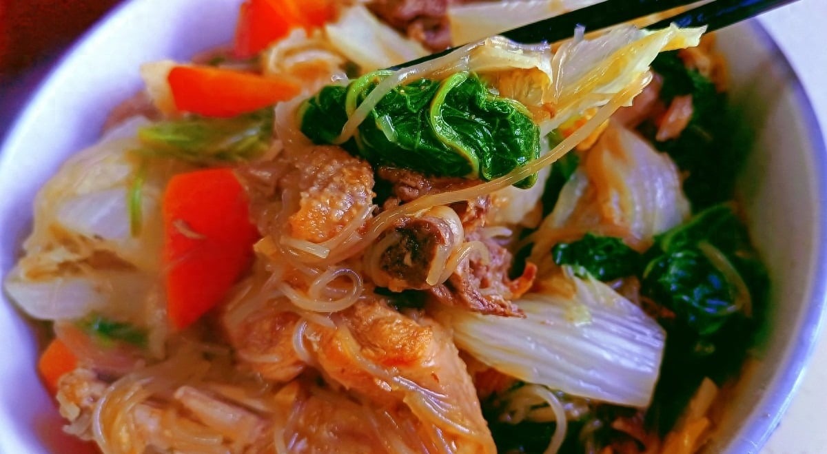 - Sau nửa tiếng, cho cà rốt và củ mài vào, tiếp tục ninh nhỏ lửa khoảng 15 phút. Sau đó, cho miến và bắp cải đã ngâm vào, đảo nhẹ nhàng cho miến ngập hoàn toàn trong nước dùng, tiếp tục ninh khoảng 5 phút cho đến khi bắp cải mềm, miến đã ngấm nước dùng, củ mài và cà rốt mềm.