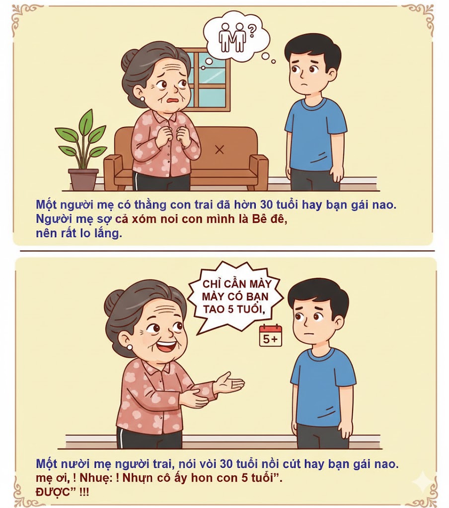 Một người mẹ có cậu con trai đã hơn 30 tuổi rồi mà vẫn chưa có người yêu hay bạn gái nào. Người mẹ sợ cả xóm nói con mình là "Bê đê" (đồng tính), nên rất lo lắng.