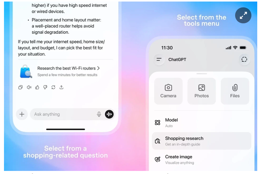 Đúng vào thời điểm nhu cầu mua sắm tăng cao dịp cuối năm, OpenAI giới thiệu tính năng nghiên cứu mua sắm (shopping research) trên ChatGPT nhằm giúp người dùng lựa chọn sản phẩm dễ dàng hơn. Tính năng đã được triển khai cho toàn bộ người dùng, bao gồm cả gói miễn phí và trả phí, trên web và ứng dụng di động, với "khả năng sử dụng gần như không giới hạn” trong mùa mua sắm lễ hội, theo thông báo của công ty.