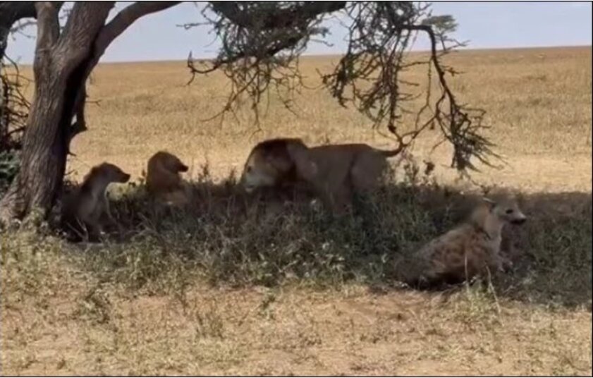 Trong lúc đang nghỉ ngơi dưới tán cây, bầy linh cẩu bị 3 con sư tử tấn công bất ngờ và một con xấu số trong chúng đã thiệt mạng.
