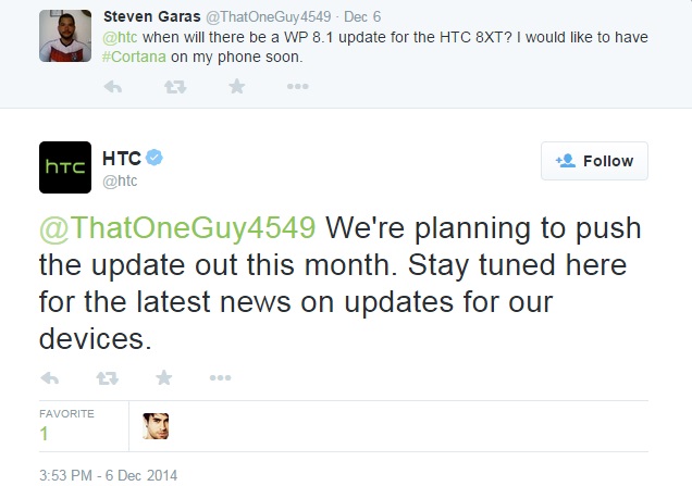 Cụ thể hơn, khi người dùng Twitter có nickname Steven Garas đã hỏi về vấn đề HTC 8XT có được cập nhật lên Windows Phone 8.1 hay không? Thì đại diện của HTC trên mạng xã hội này đã trả lời rằng, 'Chúng tôi đang lên kế hoạch để tung ra bản cập nhật này cho HTC 8XT vào cuối tháng 12/2014...'