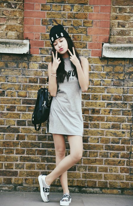 Huyền My trẻ trung trong trang phục áo thun dáng dài kết hợp cùng giày bệt ánh bạc đồng màu
