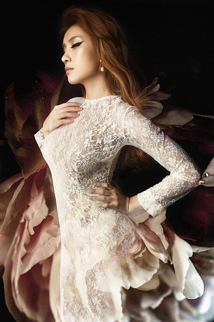 Ở một bức hình khác, Tiêu Châu Như Quỳnh diện váy ren trắng xuyên thấu, khoe đường cong cơ thể.