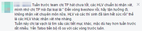 Giải thích mâu thuẫn trong nhận xét, trong khi 3 huấn luyện viên đồng quan điểm, riêng Thu Phương luôn bày tỏ sự chưa hài lòng, ông xã nữ ca sĩ giải thích: "Từ xưa đến nay, Thu Phương luôn có nhận định chặt chẽ về vấn đề chuyên môn, không chỉ thí sinh đội khác mà cả học trò của mình. Khi ba huấn luyện viên kia đều đưa ra những lời khen, Thu Phương lại tin khán giả muốn nghe điều khác và cô ấy quyết định đưa ra nhận định chuyên môn. Nếu tiếp tục khen nhau thì còn gì gọi là nhận định về một vấn đề".