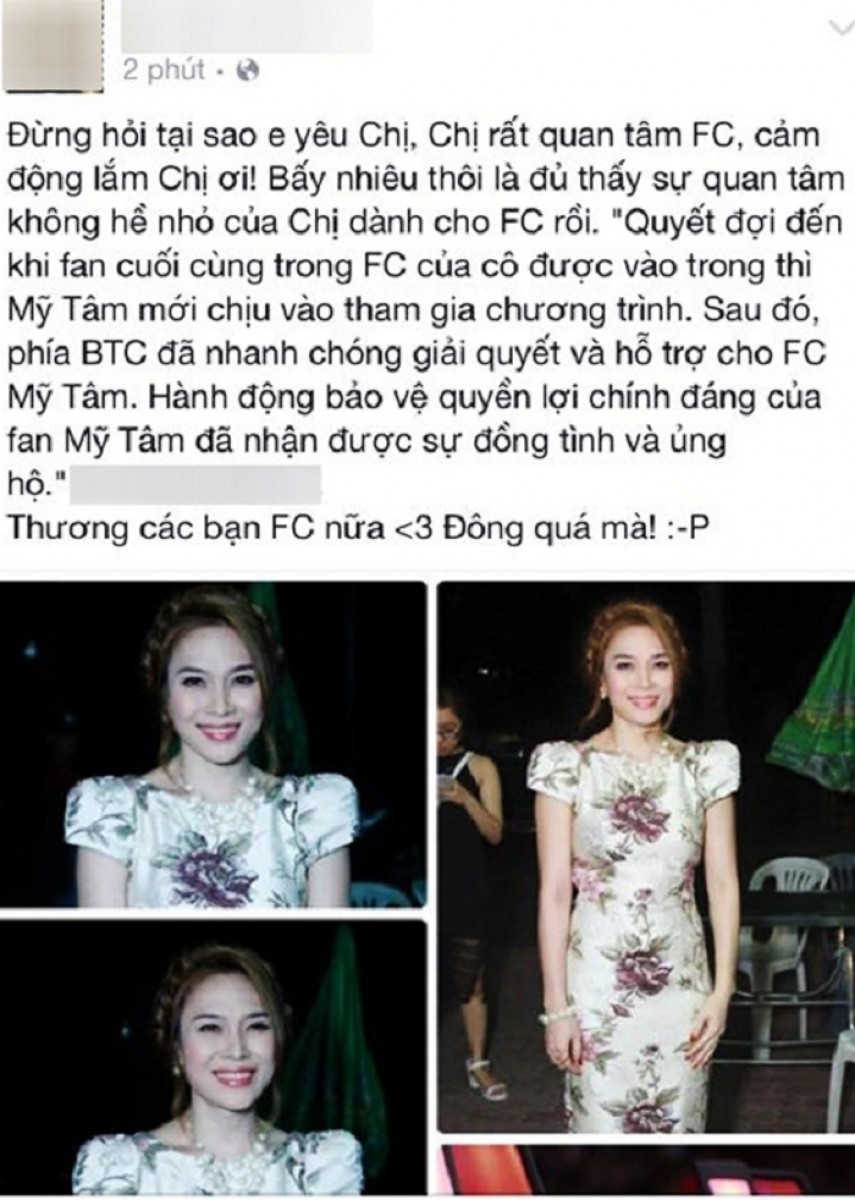 Hay mới đây, trước quy định hết sức vô lý của BTC The Voice khi không đồng ý cho cộng đồng FC của Mỹ Tâm vào bên trong khu vực cổ vũ, Mỹ Tâm ngay lập tức đặt ra điều kiện: Nếu FC không được vào thì cô cũng nhất quyết không vào bên trong.