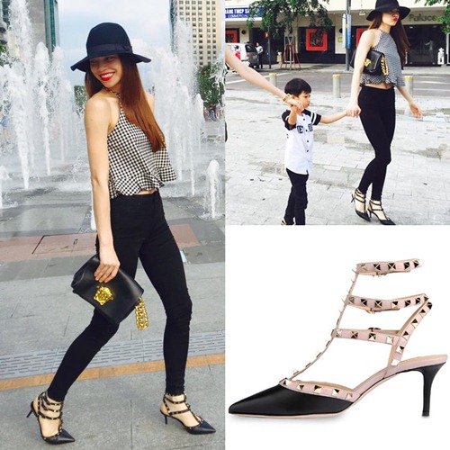 Mới đây nhất, Hồ Ngọc Hà đã cùng con trai dạo trên phố đi bộ Nguyễn Huệ trong bộ cánh street style đơn giản và ấn tượng. Đôi giày mũi nhọn đinh tán đình đám của thương hiệu Valentino chính là điểm nhấn trong set đồ của "bà mẹ một con". Để sở hữu đôi giày Valentino có tên Black leather này Hà Hồ đã phải chi ra khoảng 22 triệu đồng. Được biết cô có đến trên dưới 3 đôi với nhiều kích cỡ đế khác nhau.